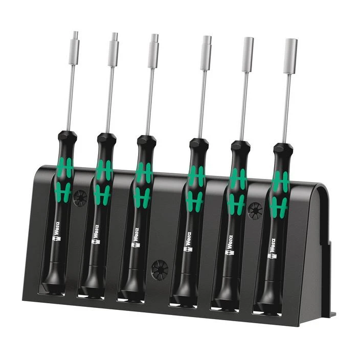 High quality Wera Micro nutsetter set for precision mechanical work. Rapid twisting is possible by fixing the hand on the twist cap and using the fast-turning zone just below it. This makes time-consuming grip adjustments unnecessary. Power zone with integrated soft zones ensure the transfer of higher tightening and loosening torque. Precision zone for the right angle for adjustment work. Includes practical rack for tidy storage of the screwdrivers.