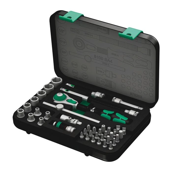 41-piece set in strong metal case 1 Zyklop ratchet with 1/4″ drive, 10 Zyklop sockets (imperial), 2 Zyklop “flexible-lock” extensions (short and long) with free-turning sleeve, 1 wobble extension, 1 sliding T-handle, 1 universal joint, 1 adaptor with quick-release chuck, 24 bits