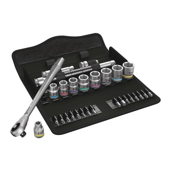 29-piece set; in a surface-preserving, compact and extremely robust textile box; low volume and weight for simplified mobility 1 Zyklop Metal Ratchet with 3/8″drive, 9 Zyklop sockets, 1 Zyklop extension (long) with free-turning sleeve, 1 wobble extension, 1 adaptor with quick-release chuck, 16 bits