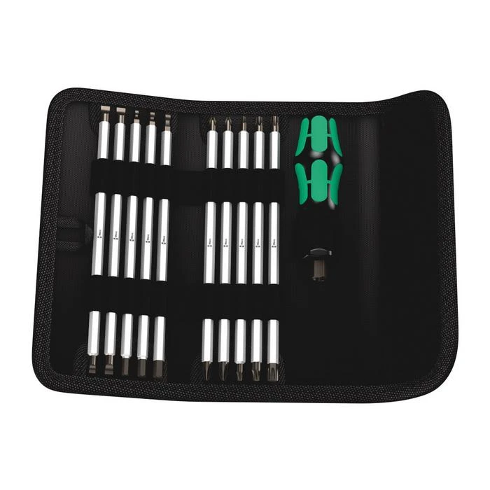 11-piece Vario set with handle and blades. In a practical belt pouch, enabling the tools to be safely and securely stored and to always be at hand. The Kraftform grip on the handle stands for pleasant, ergonomic working and makes blisters and calluses a thing of the past. Hard gripping zones for high working speeds whereas soft zones ensure high torque transfer. The hexagonal non-roll feature prevents any annoying rolling away at the workplace. The integrated hex bolster allows higher torque to be applied with an open-end or ring spanner. The double blades are out of high quality bit material and are therefore particularly durable. The Wera Black Point tip on the blade offers a perfect fit and optimised corrosion protection.