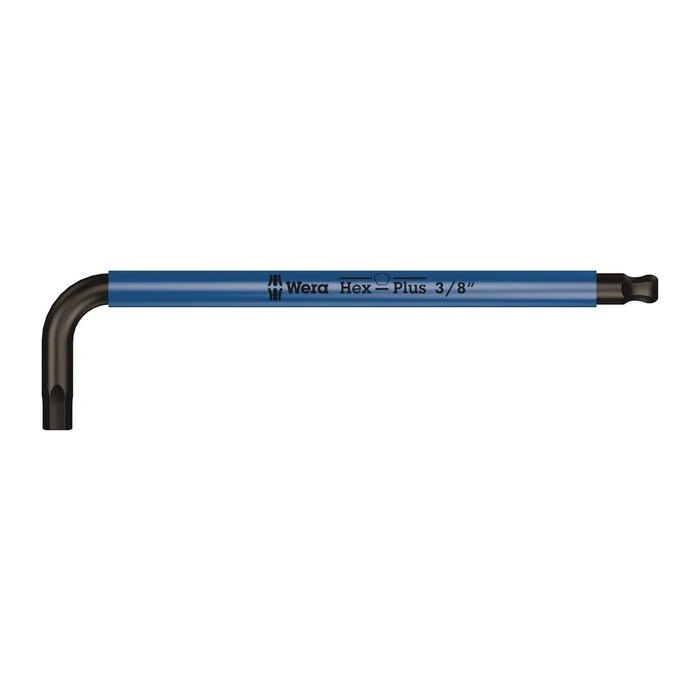 Wera L-keys with finger-protecting plastic sleeves for imperial socket head screws. This means they are ergonomic and pleasant to grip even in cold temperatures. The Hex Plus profile offers a greater contact surface in the head of the screw. The notching effect is therefore reduced to a minimum and damage to the screw head more or less eliminated. The ballpoint on the long arm allows dependable working even in difficult installation situations. The BlackLaser surface treatment provides outstanding surface protection, even against corrosion, and a long service life. Laser-engraved and thereby wear-resistant size markings on the L-keys for rapid accessing.