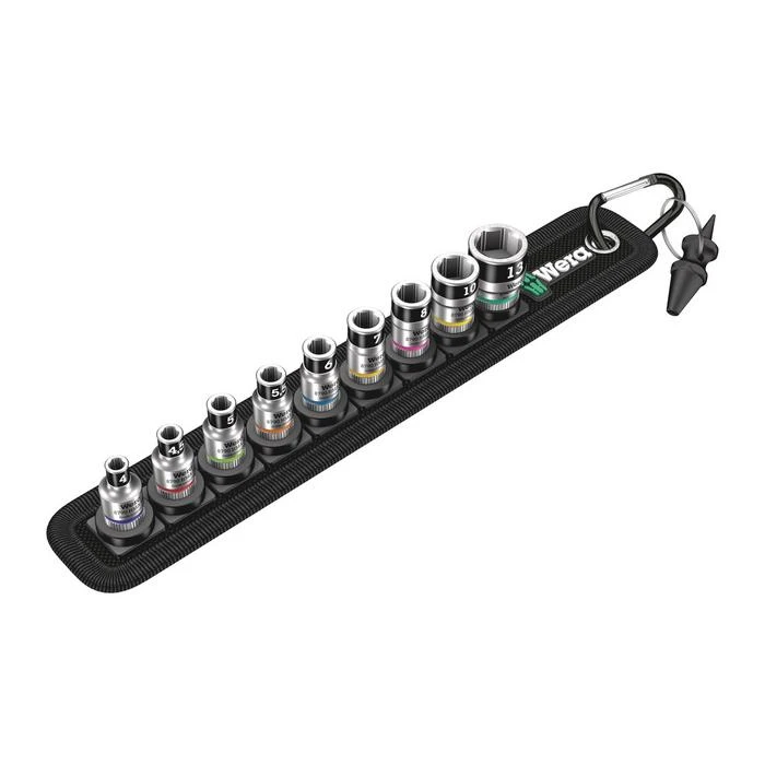 10-piece; robust textile socket belt, including snap hook to enable secure fastening to a belt loop or pocket. Non-woven reverse side and hook and loop strips for simple attachment e.g. to a wall, shelf, tool trolley and to the Wera 2go tool transport system. Fast and easy Twist to Unlock mechanism for secure storage and simple removal of the sockets. 9 Zyklop sockets with 1/4″ drive with fastener holding function. “Take it easy” tool finder: Colour coding to enable the desired socket to be easily selected. 1 tool for the simple removal of nuts from sockets with holding function.