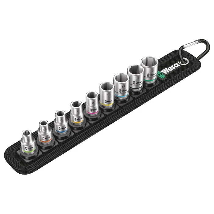 9-piece; robust textile socket belt, including snap hook to enable secure fastening to a belt loop or pocket. Non-woven reverse side and hook and loop strips for simple attachment e.g. to a wall, shelf, tool trolley and to the Wera 2go tool transport system. Smooth turning Fast and easy Twist to Unlock mechanism for secure storage and simple removal of the sockets. 9 Zyklop sockets with 1/4″ drive. “Take it easy” tool finder: Colour coding to enable the desired socket to be easily selected.