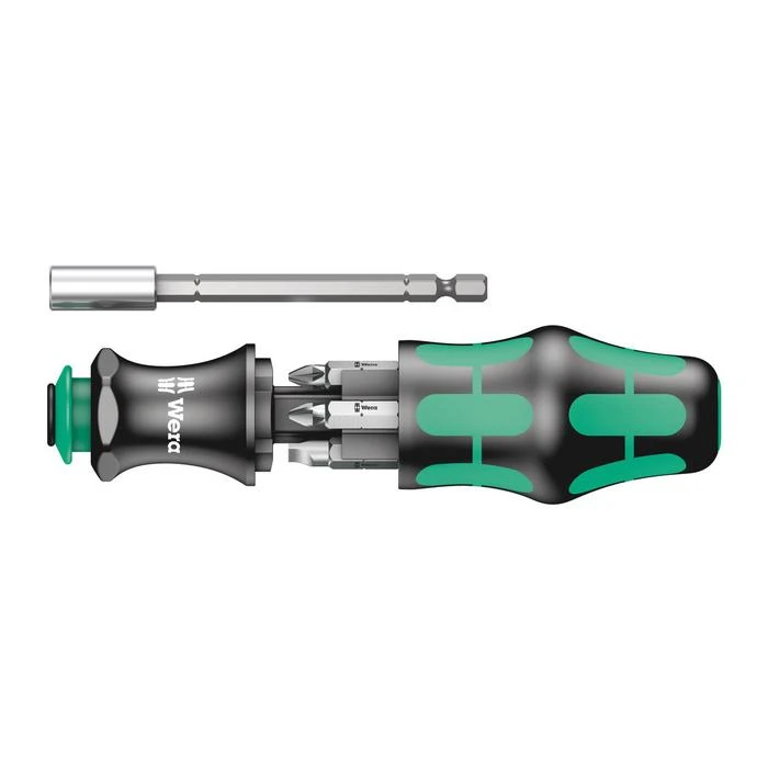 Wera compact tool with multi-component Kraftform handle for high working speeds and particularly ergonomic screwdriving. Integrated bit magazine in the handle for the storage of 6 bits.
