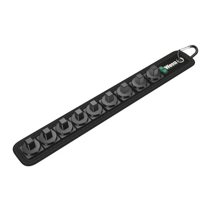 1 robust textile belt, unloaded, for up to 9 sockets and/or bit sockets, with 3/8″ drive. Comes with a snap hook to enable secure fastening to a belt loop or pocket. Non-woven reverse side and hook and loop strips for simple attachment e.g. to a wall, shelf, tool trolley and to the Wera 2go tool transport system. Fast and easy Twist to Unlock mechanism for secure storage and simple removal of the sockets.